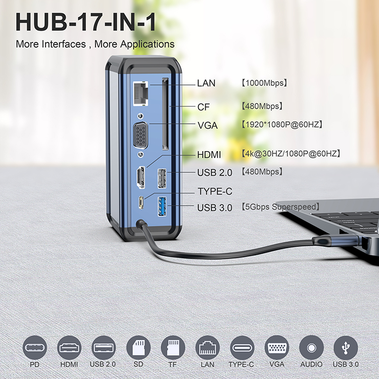 17 In 1 Hub Type C To Hdmi Vga Adapter Rj45 Lan Ethernet Sd Tf Pd Usb3.0 3.5mm Jack Audio Video Usb C Hub Computer Accessories