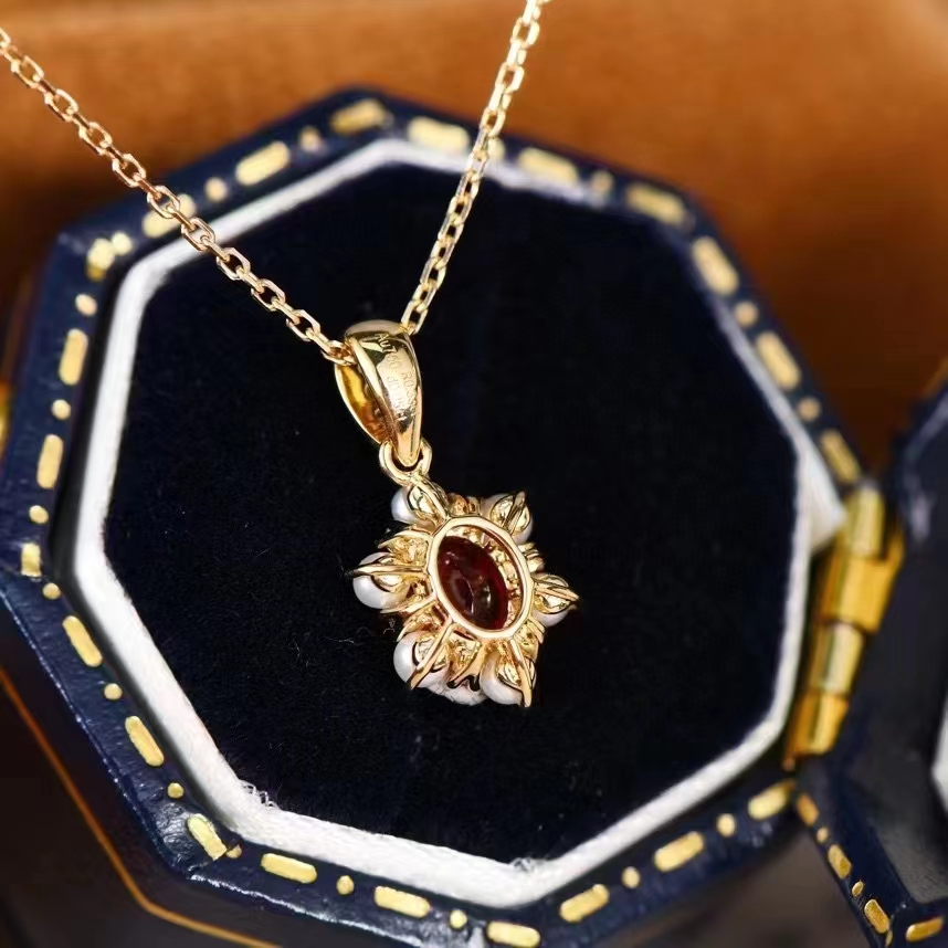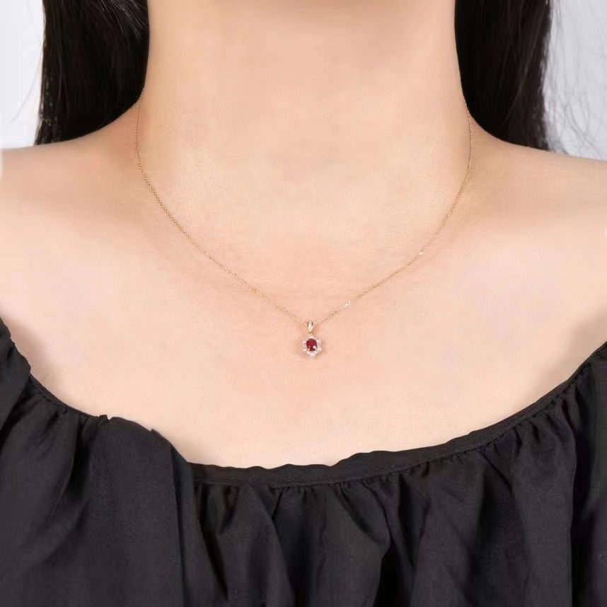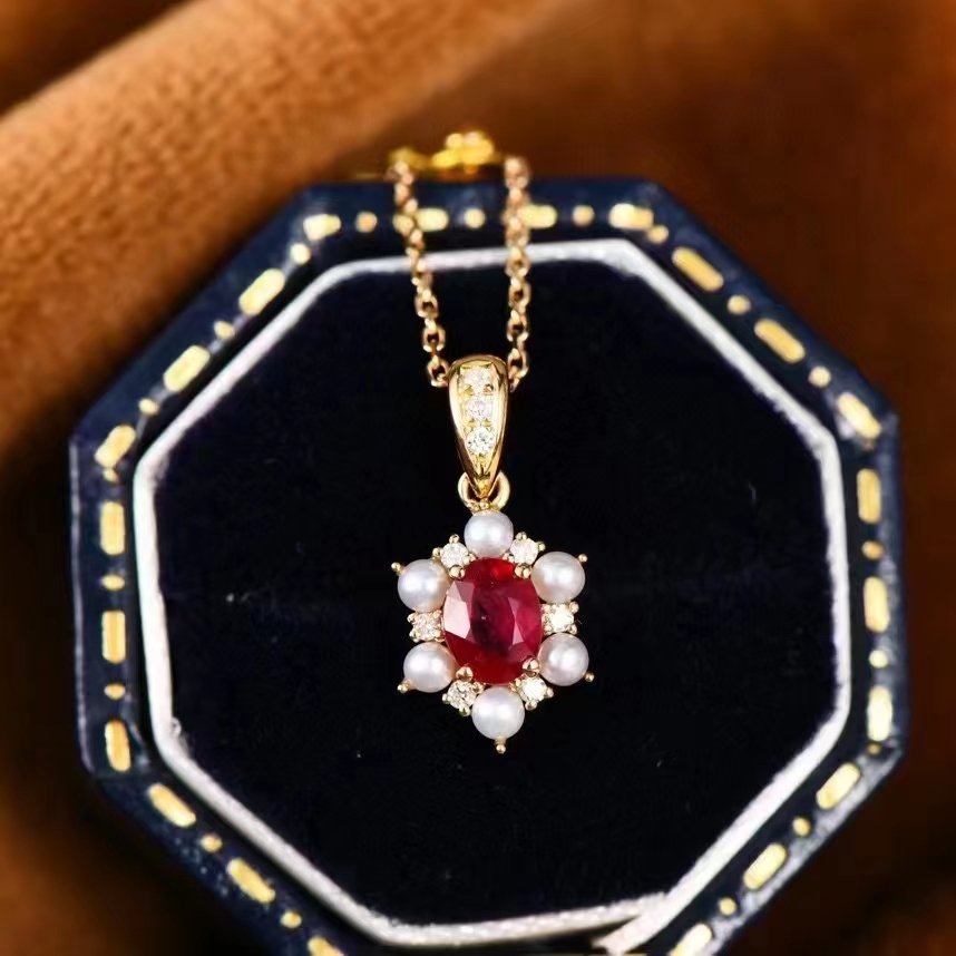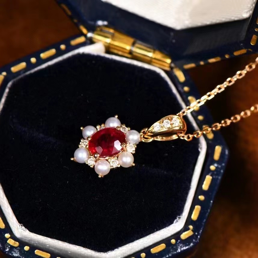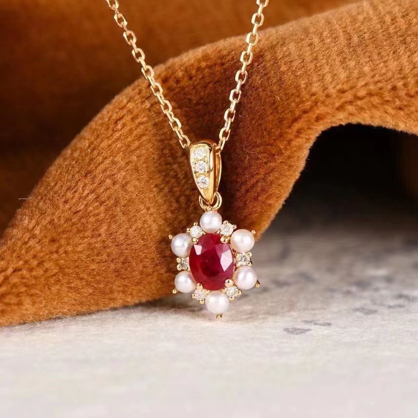 Fudian 18k Diamond Ruby Ruby Pearl Chain Oval Ruby Necklace Pearl Chain